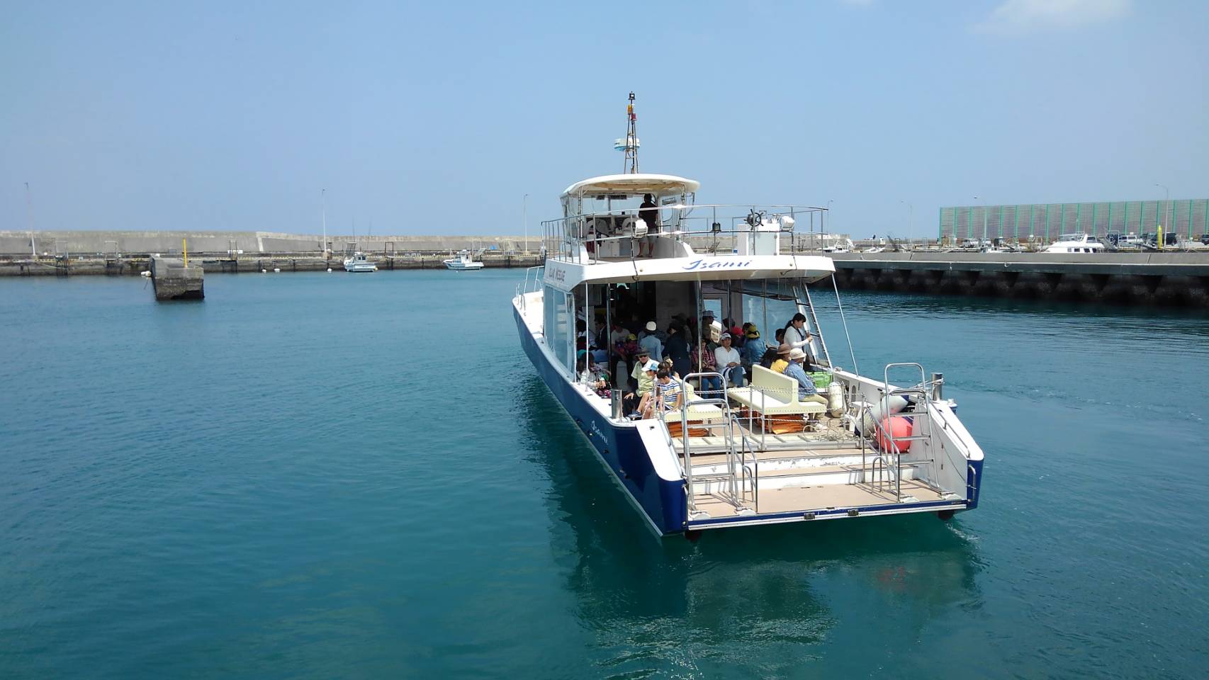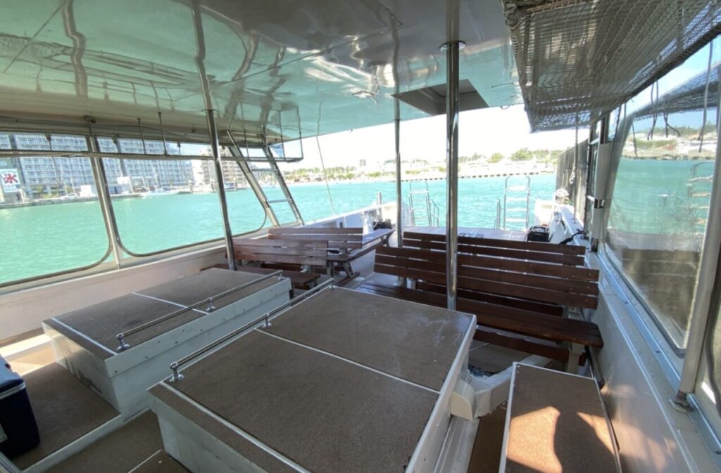 「勇海 – isami -」は波に強く、走行中の安定感も抜群です。 1階、2階、船主への移動が可能で、全てのスペースが広く作られているので快適にご利用頂けます。 特に吹き抜けの2階デッキは高さもありケラマ諸島海域を360℃見渡せる見晴らしの良さです!また10名以上着席できるキャビンルーム(室内)もあり、夏の強い紫外線や冬の北風を防げるので、小さいお子様や女性の方が多い場合の貸切にも安心です。その他、男女別水洗トイレ・海上がりには真水で体を流せるシャワーもございます。
