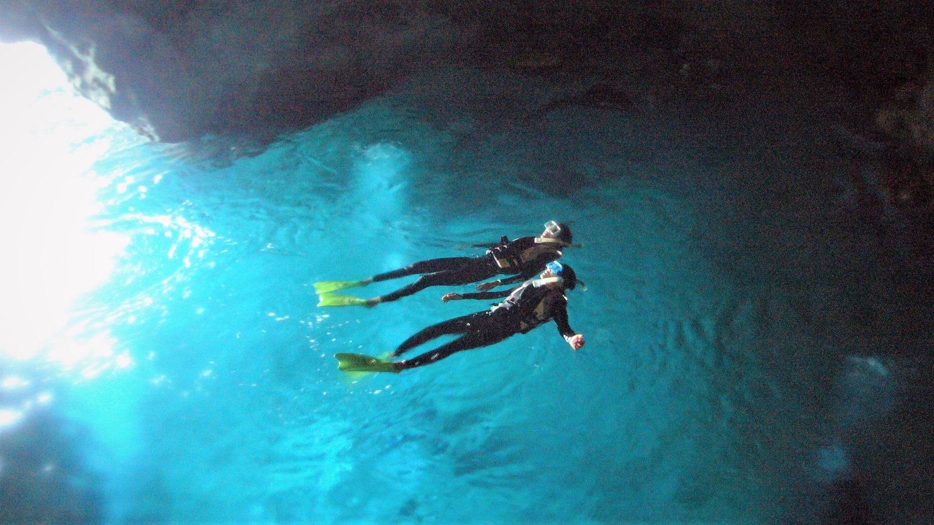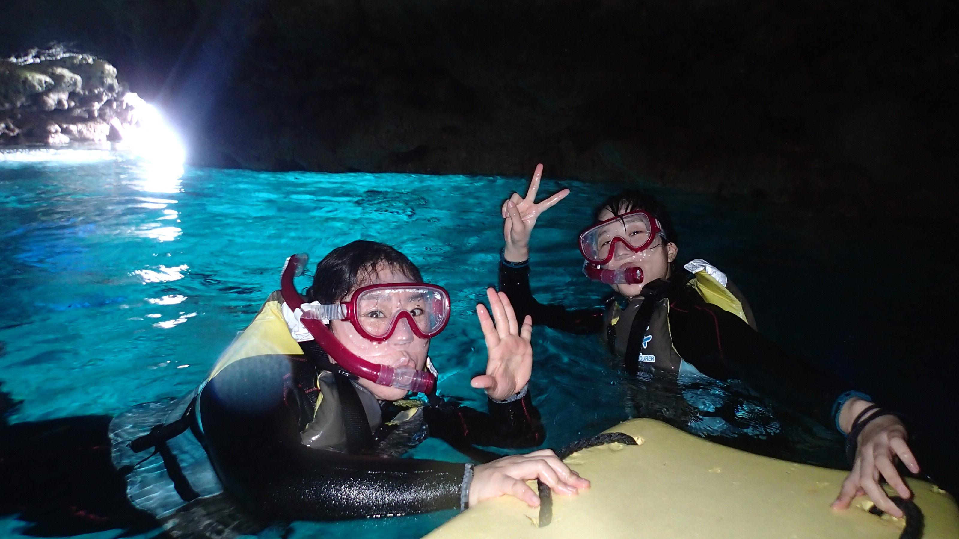 水面の青い光が洞窟内に反射し、美しく神秘的な光景、沖縄版”青の洞窟”後は、お魚にエサをあげながらシュノーケリングもお楽しみいただける内容充実ツアー♬