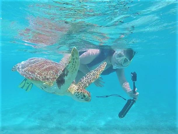 ビーチエントリーのシュノーケリングツアーでは、ウミガメに会える確率はなんと90%![]()