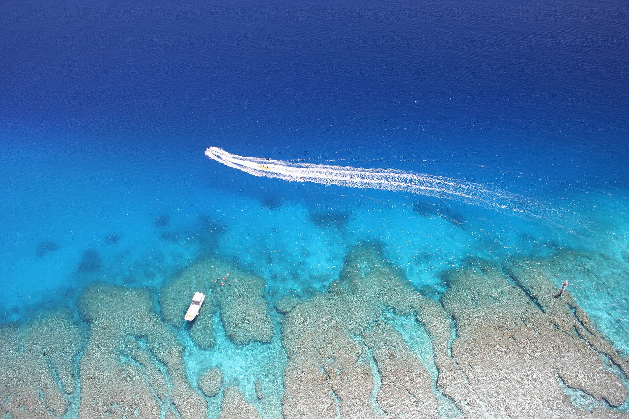 從上而下觀賞沖繩的七色海景及綿延不斷的白色海岸線,